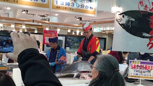 2016/03/27 近鉄上本町百貨店でマグロの解体ショーをやっていました。 偶然通りかかったのですが、なかなかの迫力でした。 今日の夕食に、と思いましたが、鍋の予定だったので遠慮しました。(H28.3.27)